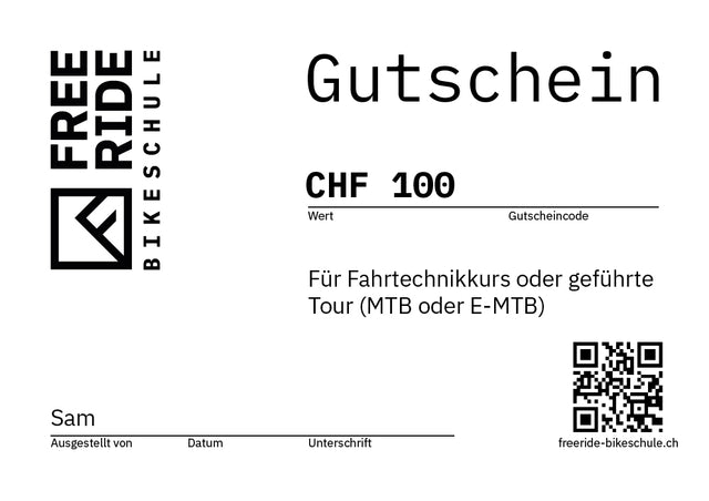 Gutschein für die Bikeschule von Freeride in Aarau und Andermatt, einlösbar für einen Fahrtechnikkurs oder eine geführte Tour.