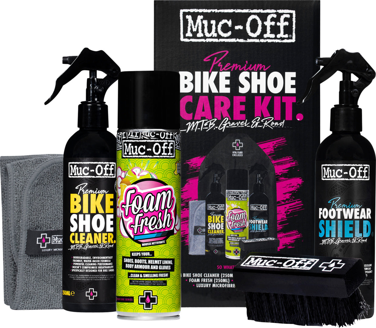 Verwöhnen Sie Ihre Füsse! Das ultimative Premium-Reinigungsset für Fahrradschuhe ist da. Das Muc-Off Bike Shoe Care Kit ist vollgepackt mit allem, was du brauchst, um deinen Schuhen etwas Liebe zu geben. Es enthält ein hochmodernes hydrophobes Regenschutzmittel, einen hochwirksamen Schuhreiniger, eine Premium-Bürste und ein Mikrofasertuch, damit Sie Ihre MTB- oder Rennradschuhe auffrischen können - egal wie schmutzig oder schlammig sie sind. Es enthält alle Werkzeuge, um Ihre Schuhe wie neu aussehen zu lassen. Keine Ausreden mehr, um sie an regnerischen Tagen nicht zu verschicken!