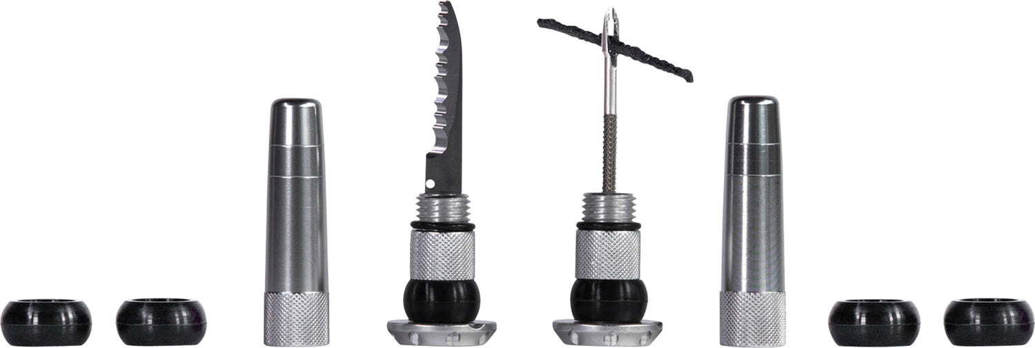 Jedes leichte und robuste Set enthält alles, was Sie brauchen, um wieder fahren zu können, wenn Sie mit einem Loch zu kämpfen haben, das sich einfach nicht schliessen lässt: eine 2-in-1-Reibahle aus rostfreiem Stahl, eine Vielzahl von Reifenschnecken in verschiedenen Grössen und ein Trimmmesser.