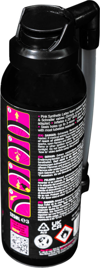 Das Muc-Off B.A.M! pumpt und repariert Pannen gleichzeitig, indem Latexschaum und Luft in den Reifen injiziert werden ? womit B.A.M. die perfekte Notfallsicherung ist, mit der 29-Zoll-MTB-Reifen in einer Minute gefüllt und Löcher bis zu 4mm abgedichtet werden können.
